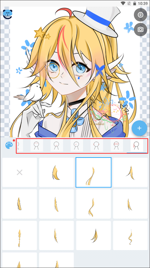 2、进入到画像编辑界面之后,就可以从眼睛、嘴巴、手、头发、衣服等各个地方进行二次创作。