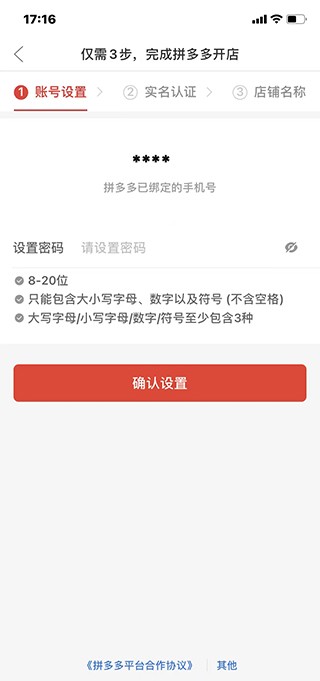 4、选择好类型之后只需三步就能完成拼多多开店,第一步设置账号,绑定手机号后设置密码。