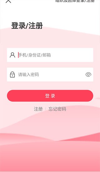 2、输入手机号或身份证号码及密码登录,首次使用请点击注册。