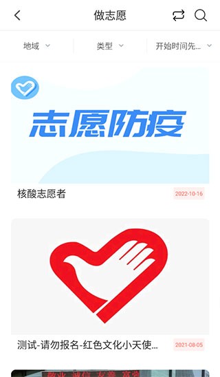 4、以“做志愿”为例,可以根据所在地域、活动类型和开始时间筛选查看各类志愿活动。