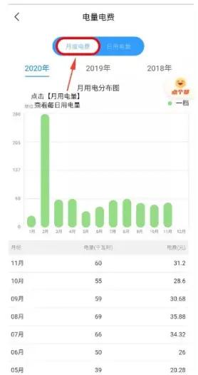 2、这个时候的界面是默认显示月用电量,可以看到每个月的用电量。