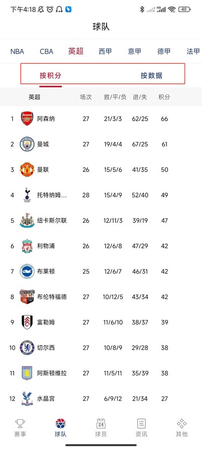 3、点击球队查看喜爱球队的排行,可选积分或数据排行