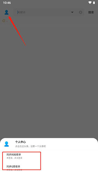 8、当然,软件支持登录,点左上角头像,弹出个人中心,选择同步歌单的类型,就可以。