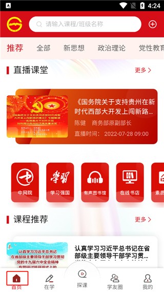 1、打开贵州网院app最新版,进入首页;