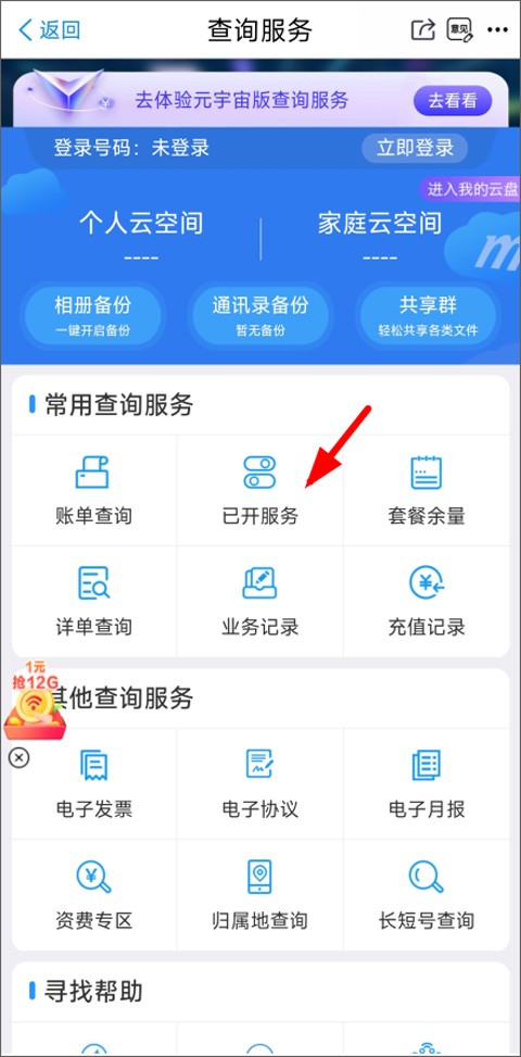 2、在查询服务页面,用户可以查看套餐余量、账单查询、电子发票等信息,点击已开业务;