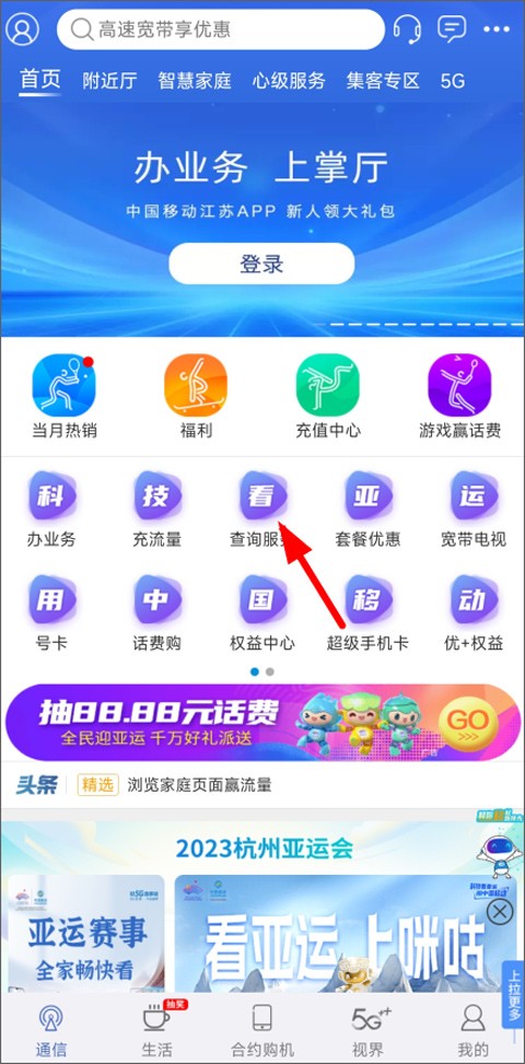 1、用户登录app后,进入通信首页,在功能栏中找到查询业务;