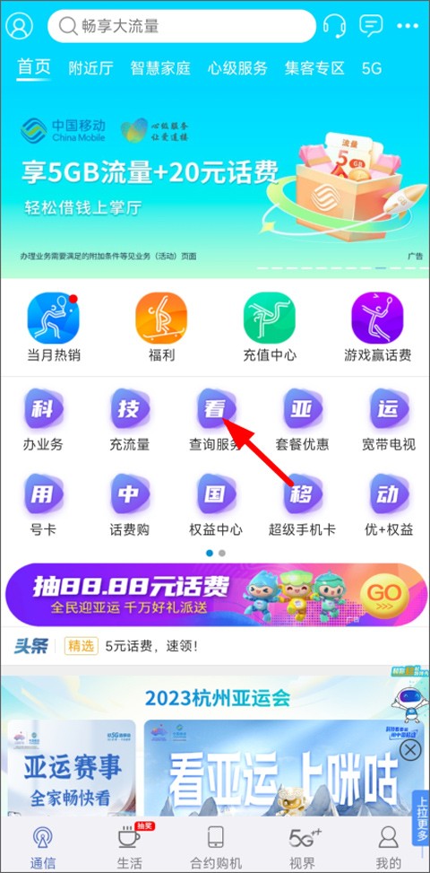 1、首先,用户需下载并登录app,进入通信首页,在此可查看附近营业厅、办理业务、充流量等,选择查询服务;