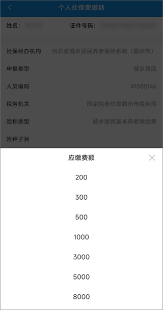 6、选择“核定申报”后,系统会带出该缴费人的核定信息,核对缴费金额无误后,直接点击“确认”提交缴费信息,进入缴费界面,缴费人需要选择缴费年度、应缴费额(可以选择200、300、500、1000、3000、5000、8000,共7个档次),全部信息核对无误后点击“确认”可跳转支付宝界面进行支付缴费。
