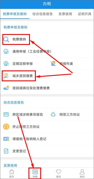 1、缴费人以个人为缴费主体,在App底部菜单选择“办税”--“城乡居民缴费”或“税费缴纳”。
