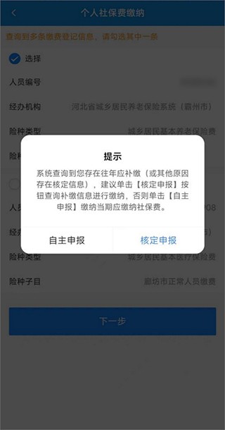 4、选择缴费险种进行缴费,系统根据证件号码、姓名,自动显示出该用户所有的城乡居民参保登记信息,选择本次缴费险种,点击下一步查询应缴费信息。