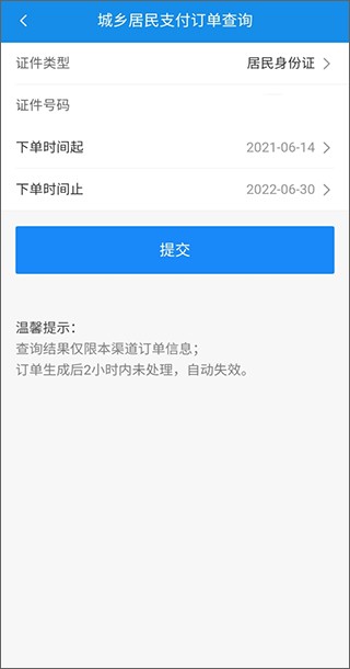 7、除此之外,城乡居民用户还可以查询支付订单,缴费人通过河北税务APP缴纳社保费后,通过此功能可以查询订单记录,输入证件号码,下单时间,单击“提交”按钮。