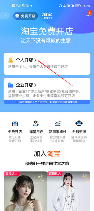 4、是个人开店,只需一个淘宝账号以及身份证信息即可,倘若是企业开店,就需要提供营业照等等基本信息。