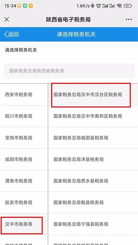 12、然后点击下方取票大厅右侧菜单,弹出界面,左侧点选“汉中市税务局”,右侧点选“国家税务总局汉中市汉台区税务局”。