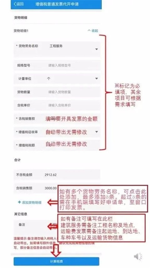 货物明细填写完成后,在最下方“备注”栏填写您需要备注的内容。备注完成后点击最下方“计算税费”。
