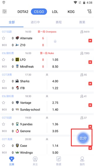 覆盖DOTA、LOL、CS:GO等众多游戏赛事,提供现场般的实时比分体验。