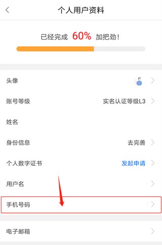 4、在“个人用户资料”中,点击“手机号码”一栏;