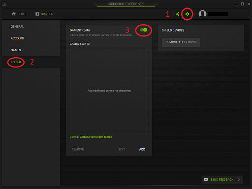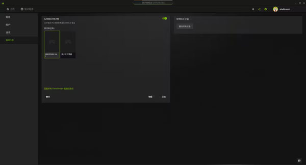 在串流PC中打开Geforce Experience,在设置里面的"SHIELD"中打开“GAMESTREAM”选项 。
