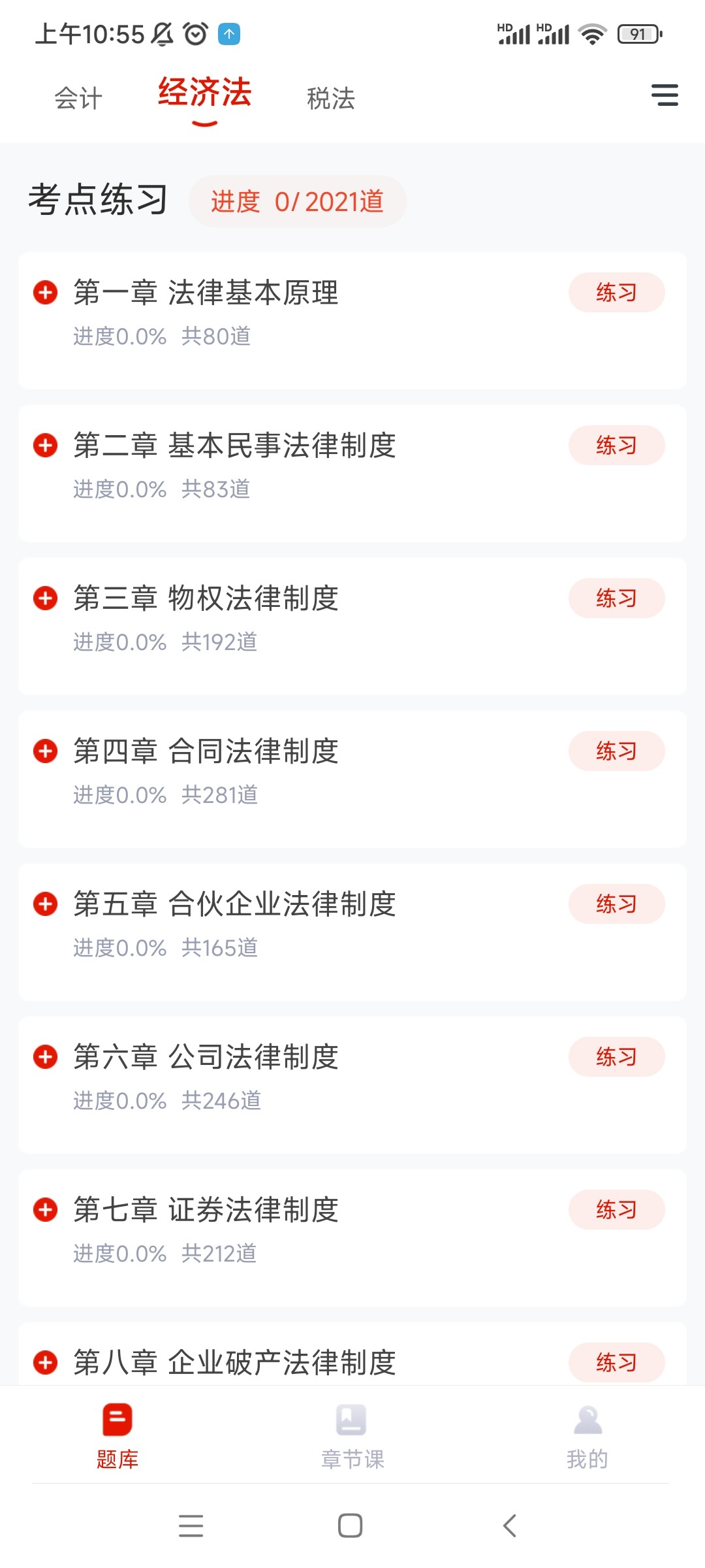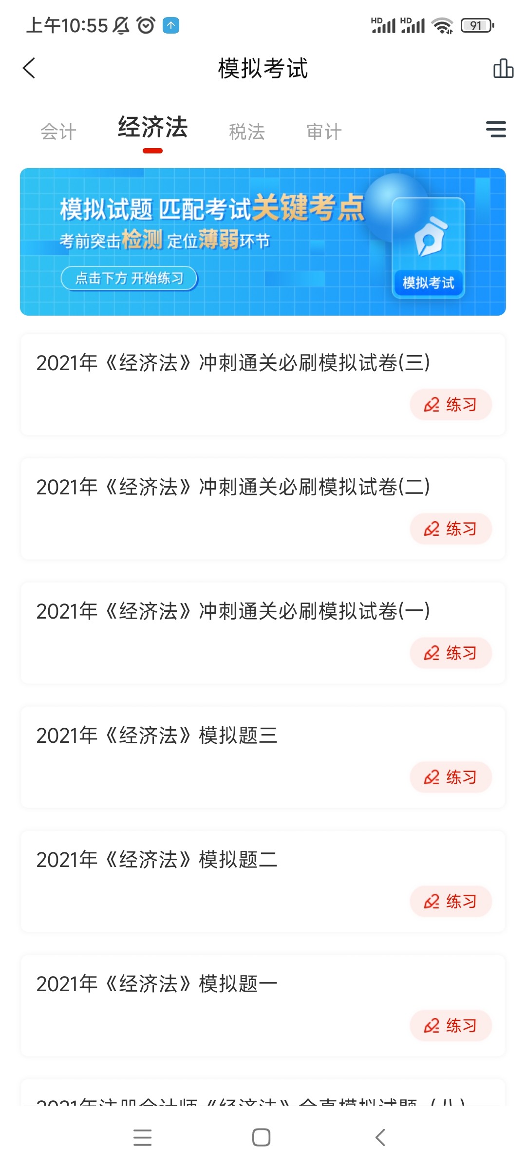 2、这里我以会计为例,进入习题界面后可以看到有考点练习、历年真题、模拟考试等多种刷题方式。