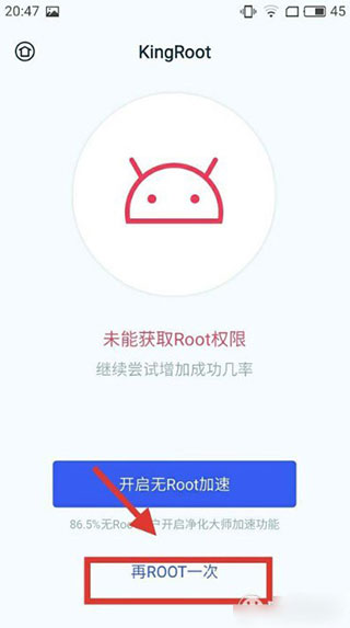 3、目前国产手机系统方案杂乱不规范,可能会出现root中途失败的情况。点击界面下方的“再Root一次”即可。若再次失败可重启手机重试。