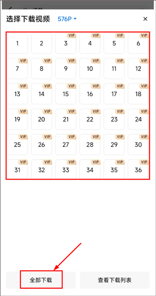 3、勾选需要下载缓存的剧集,或是点击【全部下载】。