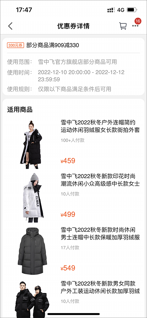 4、在红包卡券中我们可以看到有券、红包、卡、票以及其他,甚至还会为用提供那些已使用、已过期、删除等的券,就以“雪中飞官方旗舰店”为例吧,单击使用。