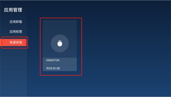 4、在电视卫士中,点击【应用管理】-【极速安装】,点击U盘。