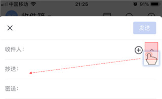 在【邮箱】文件夹列表页点击左下角【写信】按钮进入写信页面,点击收件人输入框右侧【+】按钮进入通讯录选择页面,可以便捷地选择企业通讯录或个人通讯录中的联系人进行添加,实现一键调用;