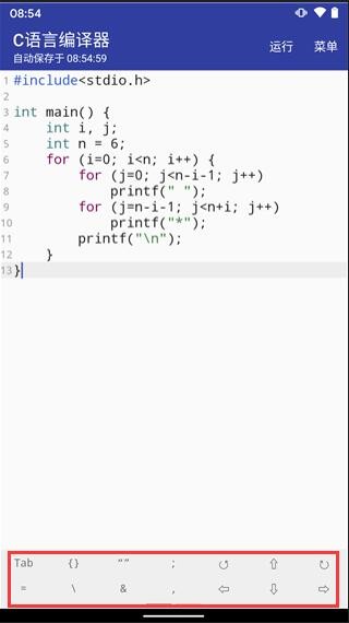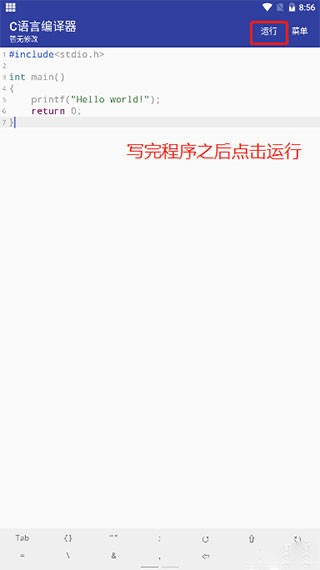 1、打开c语言编译器app之后即可直接在手机上编写代码,写完之后点击运行,可以进行代码的编译组建以及运行。