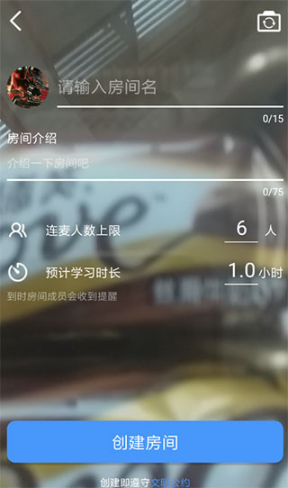 2、接下来需要按照软件的提示输入“房间名”、“房间介绍”的信息,设置“连麦人数上限”和“预计学习时长”,从而开启连麦房间