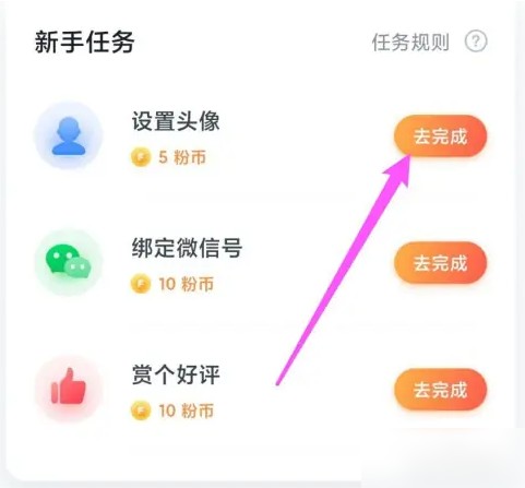 来到下一页,即可看到新手任务,选择任务,点击去完成即可获得粉币。