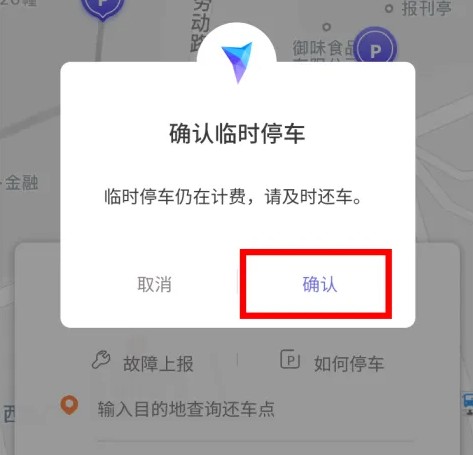 出现临时停车仍在计费确认窗,点击确认后开始临时停车;当出现“请扣锁还车”后,关闭车辆上智能锁,锁舌闭合,关锁成功;