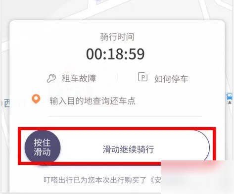 临时停车成功后首页会出现滑动继续骑行条,按住滑动继续骑行,待锁开后可继 续骑行;