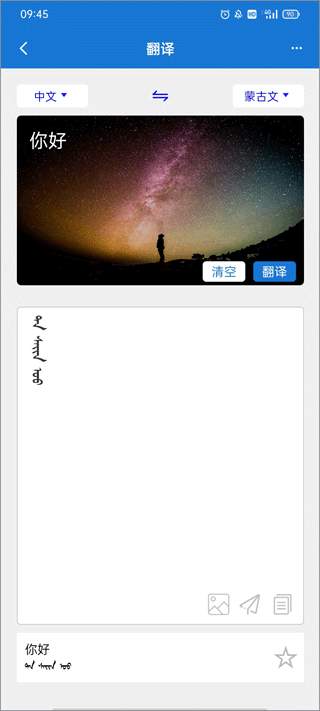 支持蒙古语汉语互译,还有英语、塔吉克语、俄语等多种语言翻译,翻译蒙文可以复制收藏,对在社交软件上使用蒙文翻译聊天、蒙文办公和内蒙古旅游中的沟通都非常方便。