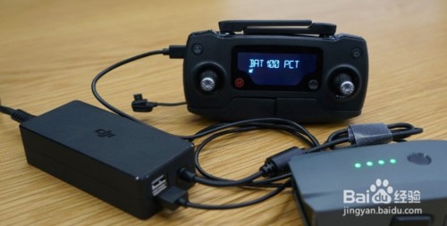 起飞前确保无人机和遥控器的电池都已充满。把Mavic Pro的电池与充电器连接,充满后指示灯将自动关闭。为遥控器充电,需要用一根Micro USB数据线,将其与遥控器左端的接口相连,然后再与充电器连接。此次的Mavic充电器还有一个冗余的USB充电口,可以同时为你的手机和平板充电。