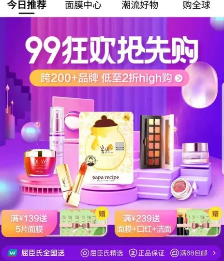 第二步:以屈臣氏官方商城为例,在商城主页获取活动信息,以图中的“99狂欢抢先购”活动为例,点击进入到活动主页;