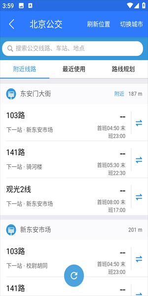 5、实时公交可以查看自己的公交车情况,查附近线路以及线路规划。